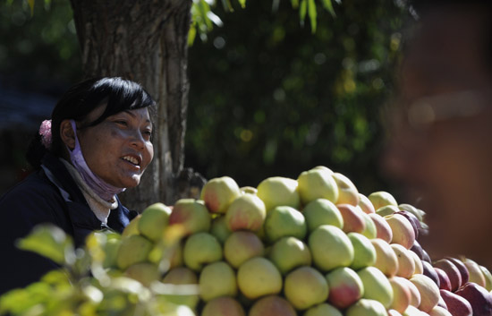 一位藏族妇女在路边摆摊叫卖苹果(10月24日摄)。