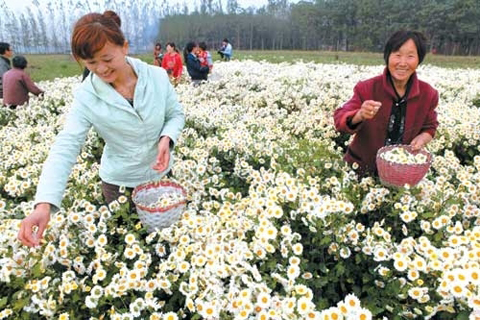 10月24日,在安徽省亳州市谯城区十九里镇沈营村亳菊生产基地,村民们在采摘亳菊。 眼下,在“药材之乡”亳州市,正值“中国四大名菊”之一的“亳菊”秋季采收期,当地菊农正抓住晴好天气,开始大面积采摘亳菊。作为亳菊的主产地,亳州市大力发展亳菊等无公害中药材种植,亳菊已经成为当地药农增收致富的主要中药材。