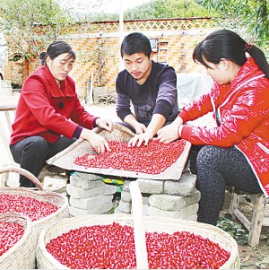 西峡县二郎坪镇栗坪村马金怀刚刚采摘的山茱萸晶莹剔透,惹人喜爱。今年他家的500余棵山茱萸喜获丰收,可收入4万余元。宛西制药在该县建立22万亩标准化山茱萸基地,带动了20万药农致富。
