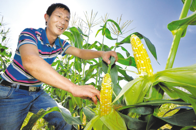 近期,陶山镇荆谷农民种植的黄白双色水果玉米到了采收上市季节。昨天上午,记者在荆谷金山村看到,农田里成片的玉米植株,每株上面都长着一个成熟的玉米荚。村民潘基业在田头掰玉米,每天能采收数十公斤。