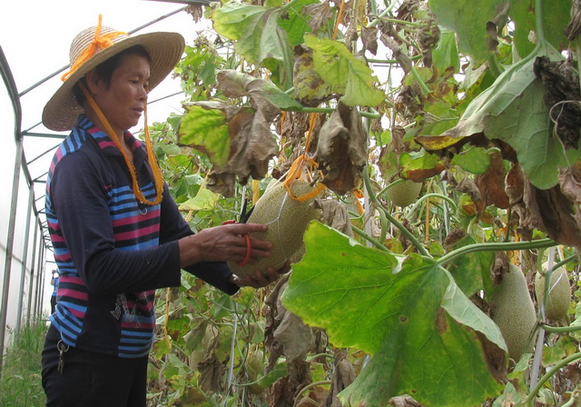 荔浦县青山镇松林村刘家厂屯农民刘达贤大胆从区农科院引种哈密瓜,采用大棚方式可实现一年双季种植,20余亩的大棚里挂满了硕大的哈密瓜,场面十分喜人。由于瓜体型美、味道香甜、色泽鲜黄而倍受客商青睐,市场供不应求,价格稳在7元/公斤,亩产可达2800公斤以上。图为刘达贤今年种植的秋瓜相继成熟,陆续上市。