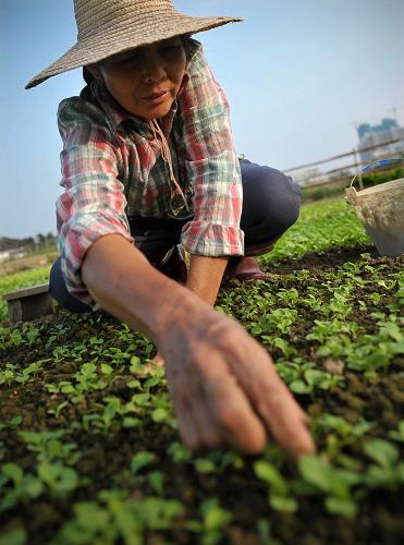10月29日,一名农民在海口市郊的菜地里为小白菜育苗。