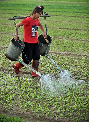 10月29日,一名农民在海口市郊的菜地中浇水育苗。