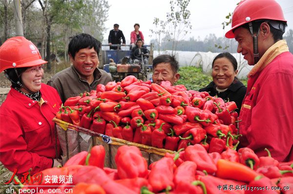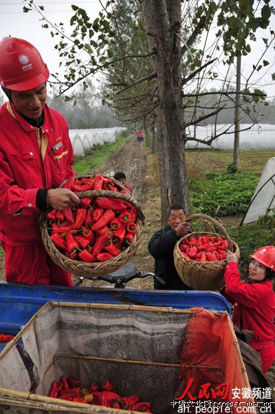 在安徽省阜南县会龙乡卢庄村,阜南县供电公司的“小红帽”服务队队员刘桂林、吴雪正在帮助椒农们采收辣椒。