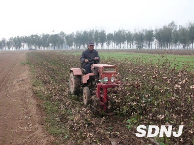 棉花是山东省武城县最主要的经济作物,据最新统计,2011年全县棉花种植面积已到达40万亩,每年的这个时候最令棉农们头疼的就是拔棉柴,人工收获劳动生产率低,一个青壮年劳力一天最多能拔2亩棉田还累的腰酸背痛。而且人工拔棉柴由于力度不均,有部分棉株的根部仍留在地里,对犁地和播种作业质量有很大影响。为解决这一难题,该县农机部门利用补贴惠农政策鼓励农民购买结构简单、造价低的20马力左右的拖拉机配套棉花拔柴机,这种机型省时省力、操作方便、安全性高而且能够清理土壤中的地膜;改变了传统人工拔棉强度大、效率低的状况。