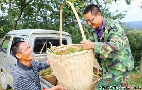 德清县武康镇对河口村村民胡林华(左)日前在承包山上开始采摘板栗,并及时装车运往山下。板栗是对河口村的主导产业之一,种植面积达3000多亩。为帮助农户增收,该村成立了专业合作社,并建起了储藏板栗的冷库,使板栗成为村民致富的“摇钱树”。