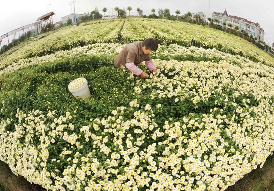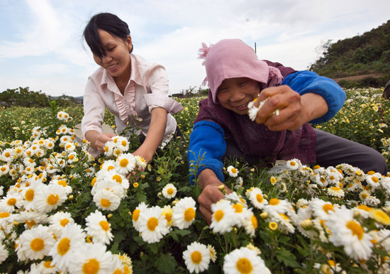 11月1日,工人在浙江舟山市白泉镇采摘杭白菊。