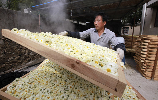 11月1日,浙江舟山市白泉镇的工人将采摘的杭白菊进行集中晾晒。