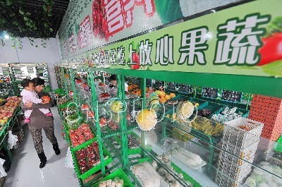 2011年11月2日,市民在山东省青州市一社区果蔬直供超市选购蔬菜。为确保市民在家门口买到放心廉价的蔬菜水果,近日山东省青州市组织果蔬种植专业合作社与城区居民社区对接,通过在社区开设果蔬直销超市,将新鲜优质的蔬菜、水果从生产基地直接供给小区居民,减少流通环节,将实惠让利给居民。