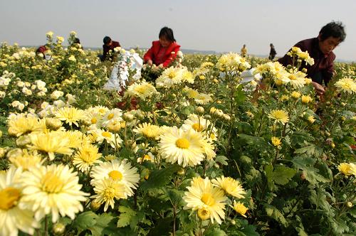 河南省武陟县北郭乡北郭西村村民在采摘怀菊花(2011年10月28日摄)。新华社发(冯小敏 摄)