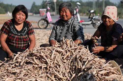 在安徽省亳州市谯城区姜庄村,村民晾晒中药材白芍(2011年9月22日摄)。新华社发(刘勤利 摄)