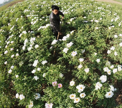 药农在安徽省亳州市南部新区张庄村牡丹地里管理药材(2011年4月20日摄)。新华社发(张延林 摄)