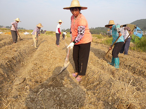 11月3日,在玉州区仁厚镇茂岑村粮食种植大户黎彬贞的250亩刚刚秋收完毕的地里非常热闹,耕田机忙着耙田,雇用的200多个农民在犁好的地上种上高产马铃薯、洒上农家肥。今年玉林市加大力度打造现代农业基地,在冬种过程中呈现出大户带头搞种植,引领玉林的冬季农业开发向专业化、标准化、规模化、集约化转变。
