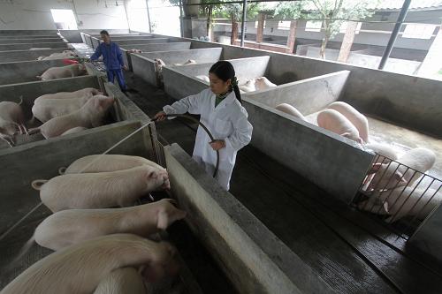 重庆市荣昌县是全国优质生猪养殖大县,荣昌猪与东北民猪、太湖猪并称“三大名猪”。荣昌猪育子力强、成熟期早、瘦肉率高,其品种形成已有400多年的历史。目前,荣昌全县规模化养猪场已达310家,预计2011年全县出栏生猪280多万头,销售收入超30亿元。位于荣昌县清升镇的“荣昌猪生态养殖示范场”由荣昌县惠民畜牧发展有限公司打造。该养殖基地保证品种选择纯种“荣昌猪”,并从场址、饲料、水源等环节加强饲养管理。所产猪肉全部采用“猪身份证”、即RFID(射频识别)生猪质量安全溯源系统,以实现生猪来源追溯和生猪产品质量、流向可追溯,确保每块生态猪肉食品安全。新华社发(朱芸锋 摄)
