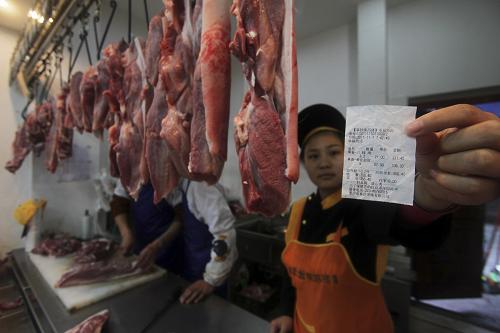 11月7日,在重庆荣昌县荣昌猪生态养殖示范场肉产品专卖店,店员展示显示RFID(射频识别)生猪质量安全溯源系统条码的销售小票。