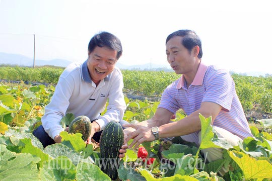 黄开宏局长(左一)查看南瓜长势