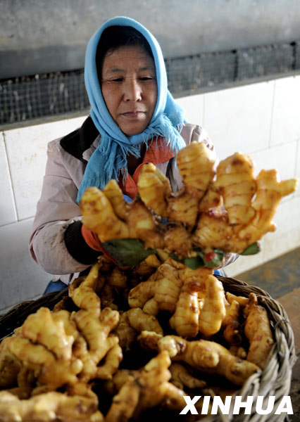 今年抚宁县生姜种植面积达2.3万亩,总产量11万吨,目前全部滞销。为缓解生姜滞销的问题,秦皇岛市商务局已向各县区商务局、大中型连锁超市下发了紧急通知,要求各县区商务局引导大中型连锁超市,特别是农超对接试点企业赴抚宁县直接采购,连锁超市要设立专柜,扩大生姜销售。要求县区大型农产品批发市场购销生姜,并在市场内设立生姜销售专区,在一定时期内减免摊位费。他们还将生姜的价格、品种、产量等相关信息发往商务部网站,以此来增加销售渠道。同时还组织力量前往北京、上海、天津等地联系生姜深加工企业和各大超市,解决姜农卖姜难的问题。为了帮助姜农卖姜,秦皇岛市的多家媒体也纷纷播报呼吁广大市民购买“爱心姜”,尽量减少姜农的损失。新华社记者李晓果摄