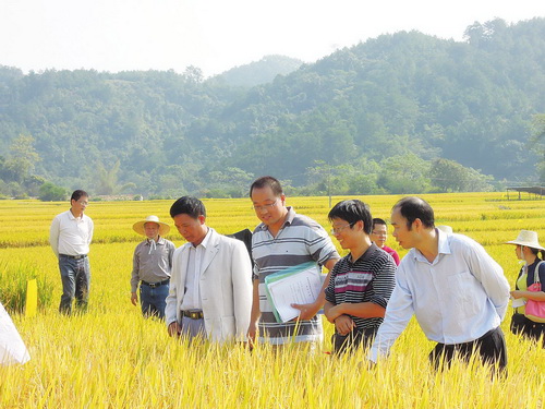 昨日上午,专家组驱车来到青秀区刘圩镇麓阳村有机优质稻标准化栽培示范基地开展验收工作。深秋时节,大地一片金黄。在金黄色的稻田边,中国水稻研究所副研究员陈惠哲弯腰摘下一弓成熟的稻穗,随手掰下一颗放进嘴里,轻咬一下后,脸上露出了满意的笑容:“颗粒饱满,不错。”