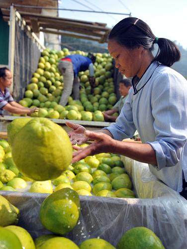 11月15日,广西天峨县双排镇龙滩库区移民向玉美在清洗收获的沙田柚,准备运送市场销售。据广西农业部门消息,2011年广西水果总产量预计达880万吨,总产值突破200亿元,占广西种植业总产值10%以上。