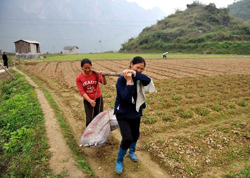 广西天峨县龙滩库区移民在田间运肥准备种植冬菜(11月15日摄)。