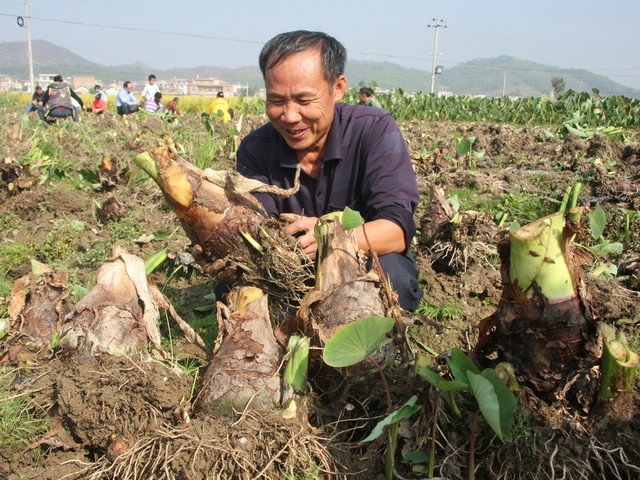 又是一年芋飘香。立冬前后,荔浦县5万荔浦芋相继出土上市。近年来,荔浦县注重将测土配方、“三避”、滴灌、生态诱虫等技术推广到荔浦芋的种植之中,鼓励农民走生态农业发展之路,可实现亩产荔浦芋2500公斤,亩产值可达到10000元以上,农业增效和农民增收有了新保障。图为芋农将个头硕大、品质上乘的荔浦芋出土上市。