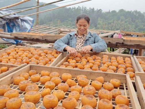 近年来,荔浦县新坪镇依托本地优势,科学规划、合理布局,重点建设农业特色产业带,基本形成了“水果、食用菌、苗木”等优质、高效农业产品的发展态势,农民收入稳步增长,仅柿子加工一项,全镇农民人均年收入就达860多元。图片为该镇大瑶村民正在加工柿子饼。