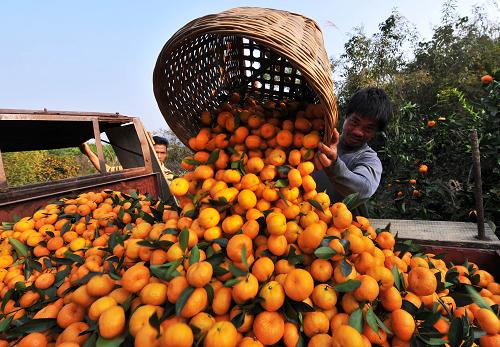11月16日,广西柳城县马山乡横山村横山屯,果农将刚刚采摘的蜜桔装上拖拉机。