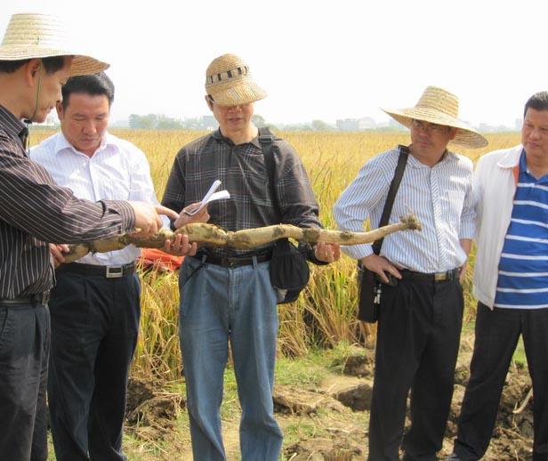 专家组成员何彬(左一)、广西调查总队杨明东(左三)、方有松(左四)等人估测单株藕茎重