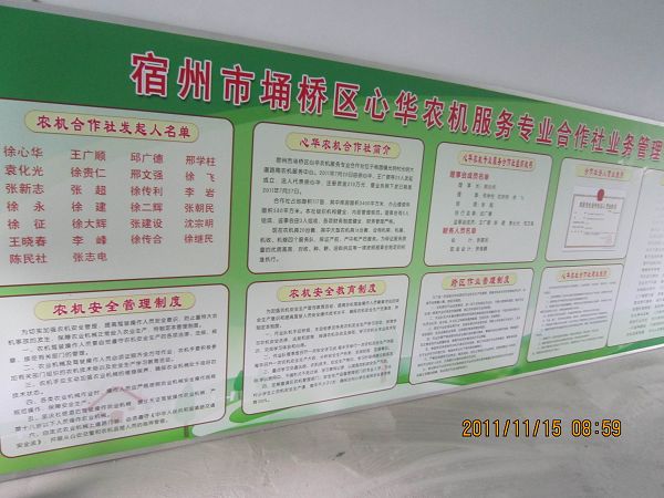 ?桥区心华农机服务专业合作社是今年?桥区农机合作组织大家庭的新成员,也是在市、区两级农机局帮扶下组建成长起来的。由徐心华、王广顺等发起成立,法人代表徐心华,注册资金210万元,现有社员26人。合作社占地11.7亩,其中库房面积3400平米,办公楼面积580平米。目前该社组织机构及内部管理初步形成。合作社有农机具20台套,其中大型农机具16台套,设有机耕、机播、机收、机修4个服务队,能够基本满足本村及周围部分村庄的产前、产中、产后服务。