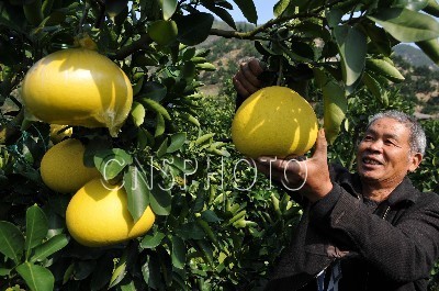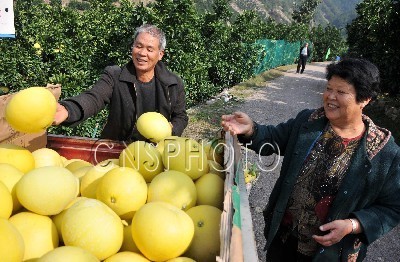 2011年11月20日,在玉环县清港镇?根村,果农正在果园内采摘柚子。