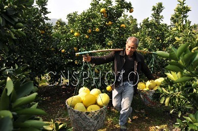 2011年11月20日,在玉环县清港镇?根村,果农将刚采摘下来的柚子挑出果园。