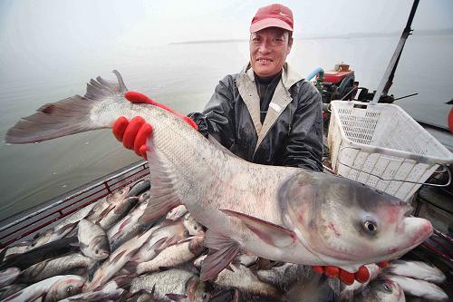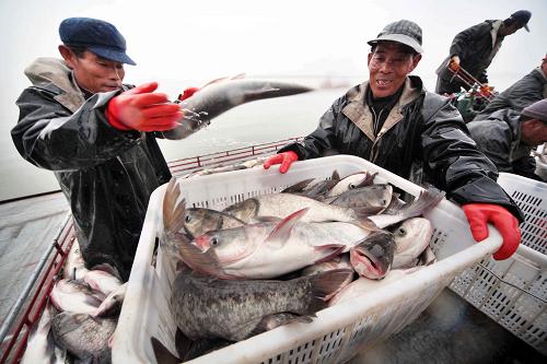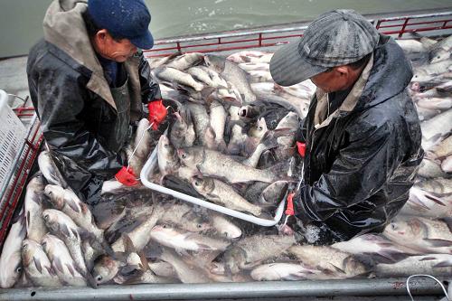 近日,江苏省赣榆县水产品大面积起捕,供应北京、上海、南京等地市场。江苏省赣榆县坚持环保优先政策,采取一系列优惠措施,鼓励引导农民发展无公害淡水鱼养殖,带动当地渔民增收。目前,江苏省赣榆县拥有无公害淡水产养殖面积25万余亩,年产鲢鱼、鲤鱼、鲫鱼、黑鱼等淡水鱼40多万吨。新华社发(司伟 摄)