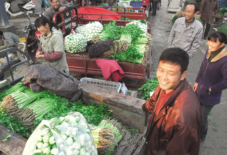 11月21日,蚌埠市淮上区吴大台村菜农在吴小街农产品批发市场里销售自家的蔬菜。据了解,该市场为了减少流通环节,保护菜农利益,采取取消购菜车辆出场收费、对菜农只收卫生费等措施,直接让利给农民,吸引了越来越多的菜农进批发市场卖菜。