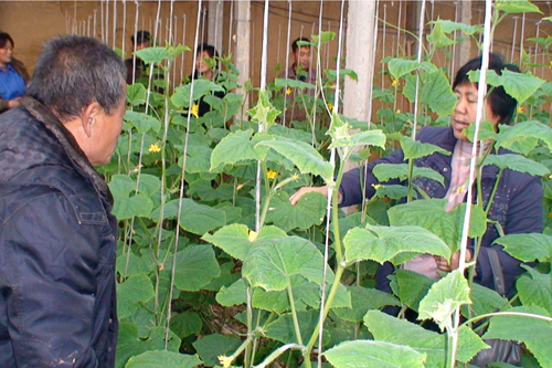 由于日前阴雨天频繁,空气湿度大,气温下降快,造成高唐县蔬菜大棚病虫害发生严重,严重影响了蔬菜的品质和产量,对农民群众丰产、增收造成了不利影响。为此,该县农业局根据当前天气情况,及时派出技术人员加强技术指导服务,给农民群众吃上了定心丸。图为该县农业局副局长杜立芝在尹集镇花园村指导黄瓜生产。