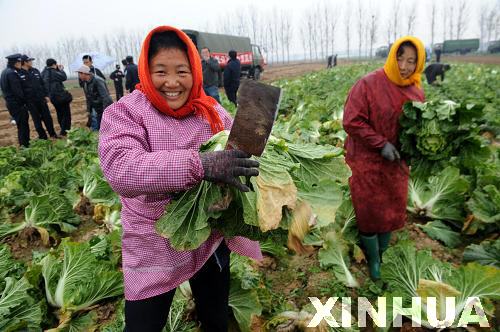 11月22日,即墨市移风镇院上村村民孙桂芝(前左)在地里采摘大白菜。她告诉记者,去年白菜地头批发价格每公斤0.84元,今年每公斤0.1元都少有问津,眼看着白菜就要烂在地里,政府组织的结对直销切实解决了菜农卖菜难的燃眉之急。