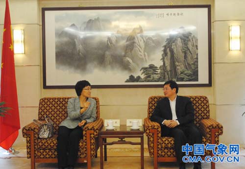 11月24日,在中国气象局与中国联通签署合作协议前,矫梅燕与陆益民进行会见 何孟洁摄影报道