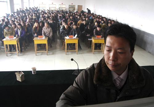 近日,河北省黄骅市官庄乡启动的菜农深造培训工程――2011蔬菜种植专业中专班开学。官庄乡的360名菜农免费接受系统的蔬菜种植技术学习,提升种植水平,学期为3年,成绩合格后颁发中专毕业证书。菜农在农闲时集中上课,农忙时边学边实践,除免交学费外,还可享受3000元的政府补助。黄骅市官庄乡是当地有名的蔬菜种植基地,全乡蔬菜种植面积2万亩,年产蔬菜6.6万吨,产值2亿多元。新华社发(傅新春 摄)