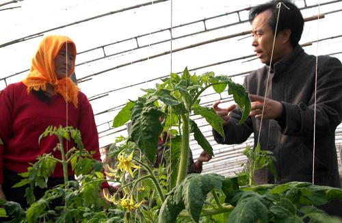11月27日,授课老师在蔬菜大棚里为黄骅官庄乡菜农学员讲授西红柿种植技术。