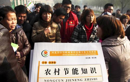 11月27日,河北黄骅官庄乡的菜农学员在领取教科书。