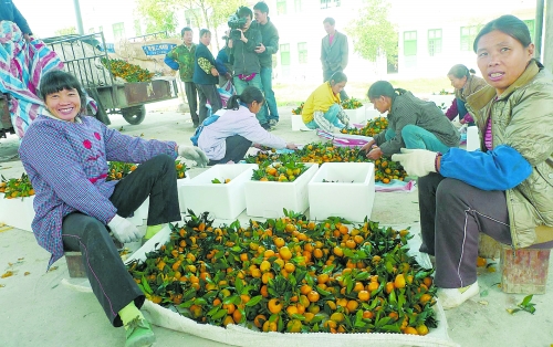 时下正是柑橘上市的时节。日前,记者在灵川县青狮潭镇和潭下镇看到,沿路果园里到处都是忙于摘果的农民。今年青狮潭和潭下两镇有近2万亩果园挂果,按时下每公斤鲜果调出价2.6元算,每亩收入4000元左右。图为潭下镇黄柏村村民在包装鲜果外销。