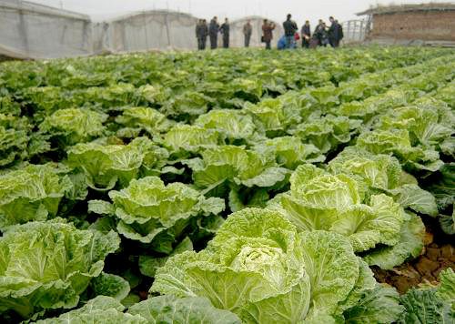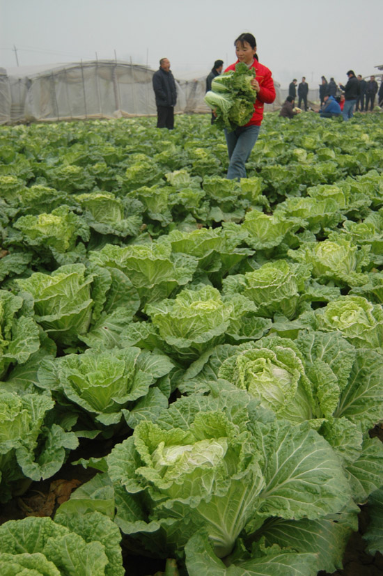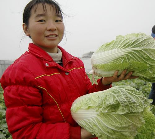 11月28日,在山东省聊城市东昌府区甜翠农产品产销专业合作社大白菜种植基地,菜农连明霞在为订单客户采收“天正橘红62”大白菜。甜翠合作社按照无公害标准种植的6亩绿色无公害大白菜,尽管还没收获,却早已被商家订购一空,在目前普通大白菜滞销的局面下赢得了市场。新华社发(张振祥 摄)
