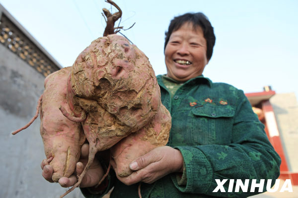 11月24日,河北省永年县界河店乡刘窑村村民王改荣在展示她种的巨型红薯。这棵巨型红薯单棵4瓜(三大一小),重约10公斤。