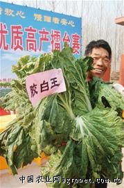 昨天,由青岛胶州张应镇政府和胶州大白菜研究所联合举办的首届高产大白菜擂台赛在张应镇安家沟村拉开了帷幕,一棵重达13.72公斤的大白菜经过称重和综合评比,从参选10棵“大块头”中脱颖而出,被评为“胶白王”,经过现场拍卖,“胶白王”被一市民以1888元买走。