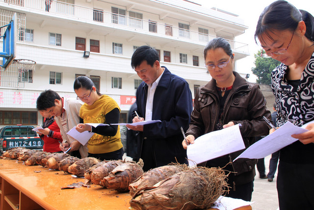 鉴定会上,农残检测人员对20个荔浦芋样品进行了农残检测,无一例超标,均达到了无公害农产品标准。上图为鉴定会现场、下图为评比专家对荔浦芋进行鉴定。