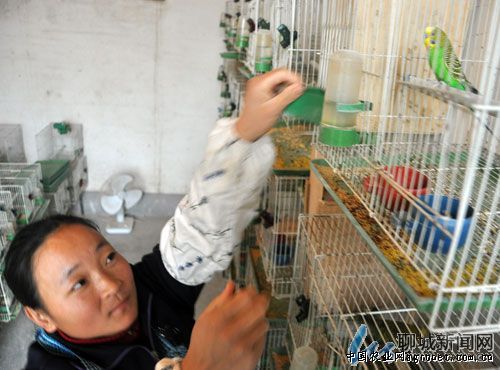 24日,在茌平县贾寨乡后寨村,贾玉红在查看鹦鹉长势。今年28岁的贾玉红去年打工返乡后学习掌握了鹦鹉饲养技术,并投资1000元从夏津引进了“虎皮”、“玄风”等品种的鹦鹉进行饲养,目前规模已达200多对。据了解,鹦鹉具有易饲养、繁殖快、市场好等特点。一对鹦鹉的市场价能卖50至100元,吸引了上海、北京、天津等地的客户前来收购,可年获利5万元左右。