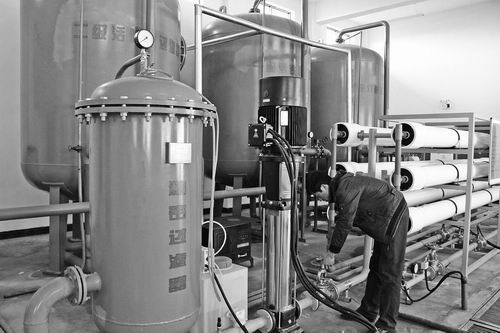 静宁县加大实施农村安全饮水工程,今年投资2699.8万元,建成原安陈岔二期、细巷谭店二期等7处集中式供水工程,解决了6乡3.85万人和51所学校0.6万名师生的饮水不安全问题。图为细巷谭店供水站工作人员正在检修供水设备。