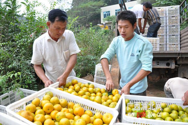 今年浦北县的柑桔生产又迎来了丰收年。据了解,今年,浦北县种植甘桔3.5万亩,预计产量3.6万多吨。目前市场收购价格达到每公斤4.6元左右,与去年每公斤2元相比较,增长了1.3倍。图为龙门镇江埠村的果农正在销售柑桔。