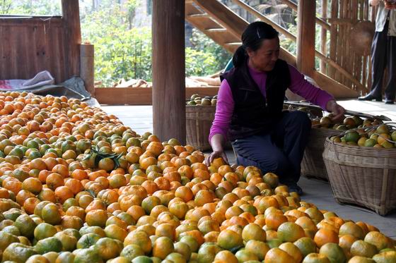 今年是水果大年,柑桔挂果特别多,每株柑桔树都要竹木棒来支撑,创历史最高纪录,这本来是件好事,然而果农却因果多滞销发愁。老堡乡漾口村是三江典型的水果村,全村有水果面积1280亩,人均果园0.75亩,今年是个丰收年,全村脐橙、沙田柚、?柑三大果产量将突破100万斤,比去增产了二倍多,11月份采收期到来时,满树的果还无人问,愁急了兴农水果专业合作社的班子们。针对柑桔丰收滞销问题,三江县农业局用创新的思维,帮助漾口村筹划第五届水果节。从11月上旬开始,县农业局由一名副局长带队,组织水果办、培训办、信息办等相关人员多次到该村调研,与村民委和合作社的班子共同探讨柑桔销售问题,策划通过举办水果节,邀请果商前来参加,寻找柑桔销路。