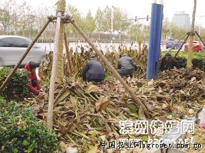 近日,在市区黄河五路记者看到,园林维护人员正在两侧绿化带里清理枯萎的绿化植物。据负责黄河五路绿化带维护工作的北京东方园林有限公司潘姓工作人员介绍,目前正在进行清除的植物是已经枯萎的美人蕉,“这些美人蕉作为绿化植被,被广泛地种植在黄河五路两侧的绿化带中,夏秋盛开季节非常漂亮。随着天气温度的降低,加速了这些美人蕉的枯萎。”潘姓工作人员告诉记者,这些美人蕉的地上部分被清除后,其根部将被挖出,并被运到专门的温室中进行保存,“这些美人蕉的根部可以存活并滋生繁殖,来年春天再种植到绿化带里。”