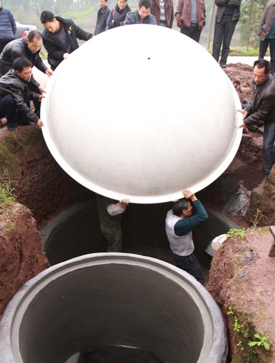 近日,广安区恒升镇果子村的村民在安装新型玻璃钢拱盖沼气池。今年,该区结合中、省、市项目资 金,区本级及乡镇财政自筹资金200余万元,为3000农民每户建1口玻璃钢拱盖沼气池,目前,全部建设完工,80%已投入使用。据了解,玻璃钢拱盖沼气 池比传统砖混结构沼气池具有密封性好、产气率高、免维护等优势。